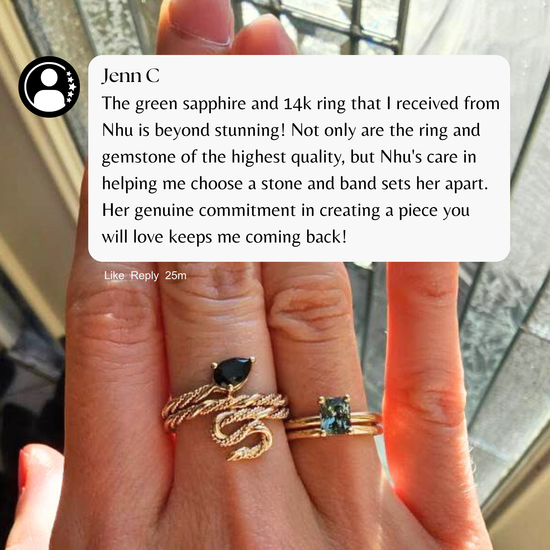 Her attention to detail is unmatched. She made sure the gem colors perfectly matched our admittedly picky preferences, and the result is a stunning, unique set I adore every single day. Thank you again, Nhu!