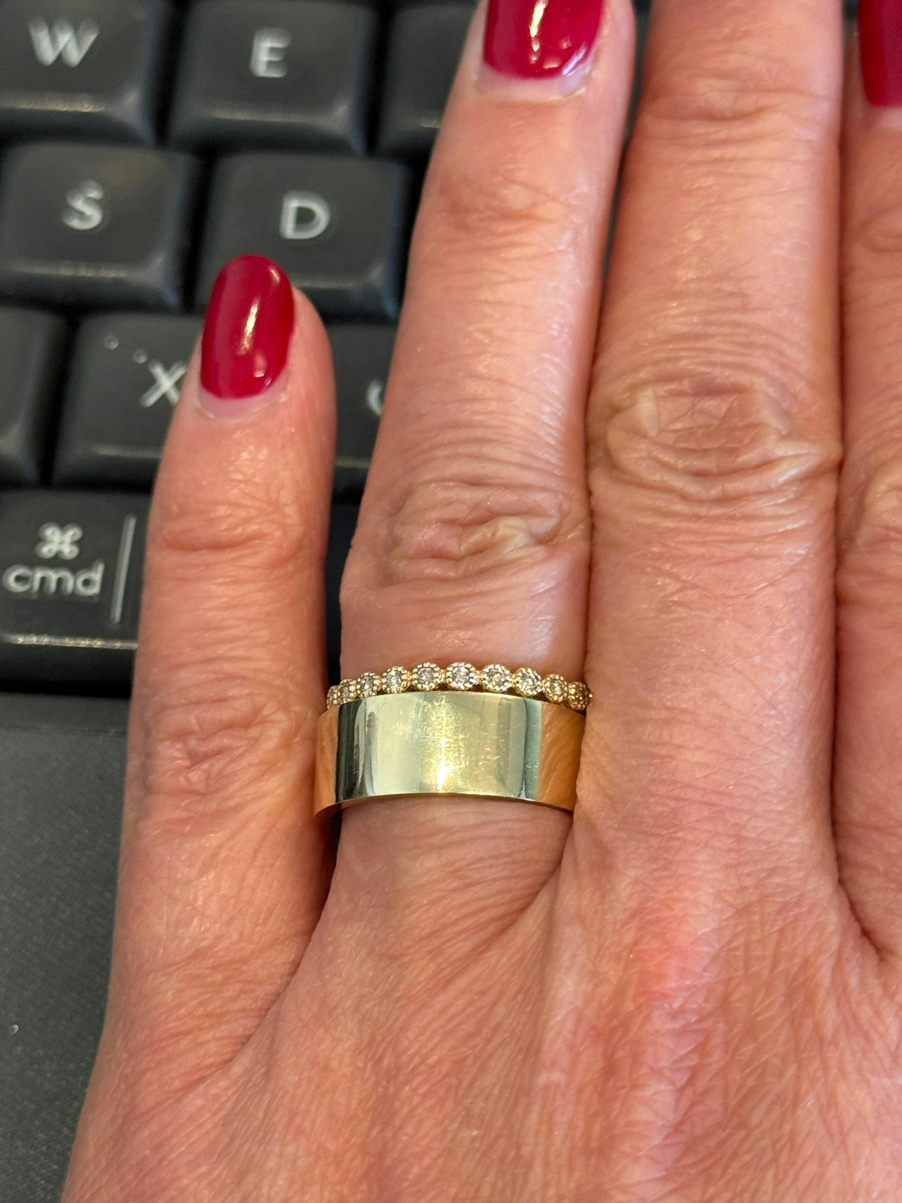 It's dainty and feels so nice on my finger. It stacked beautifully with my engagement ring. I got the glossy style and it's sooo pretty. Because it's so minimal I feel so safe doing everything with it on (sleeping, dishes, workouts, etc.). I requested it to be thinner and Nhu was happy to accommodate that for me!