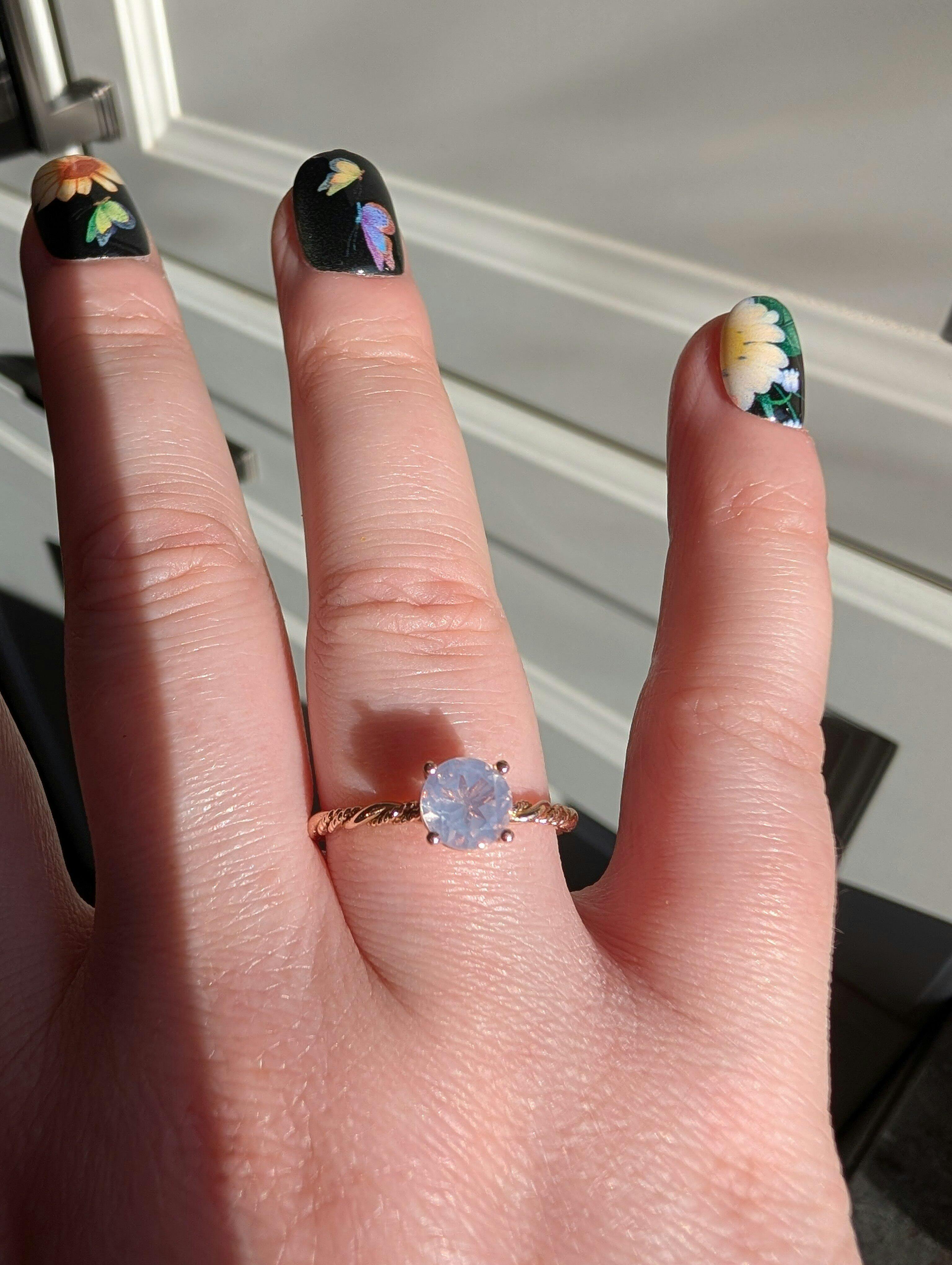 It’s so beautiful and I get compliments all the time. Very comfortable to wear. I love that I got to choose the stone I wanted with this design. The greenish blue color is my favorite and this moissanite captures it perfectly.