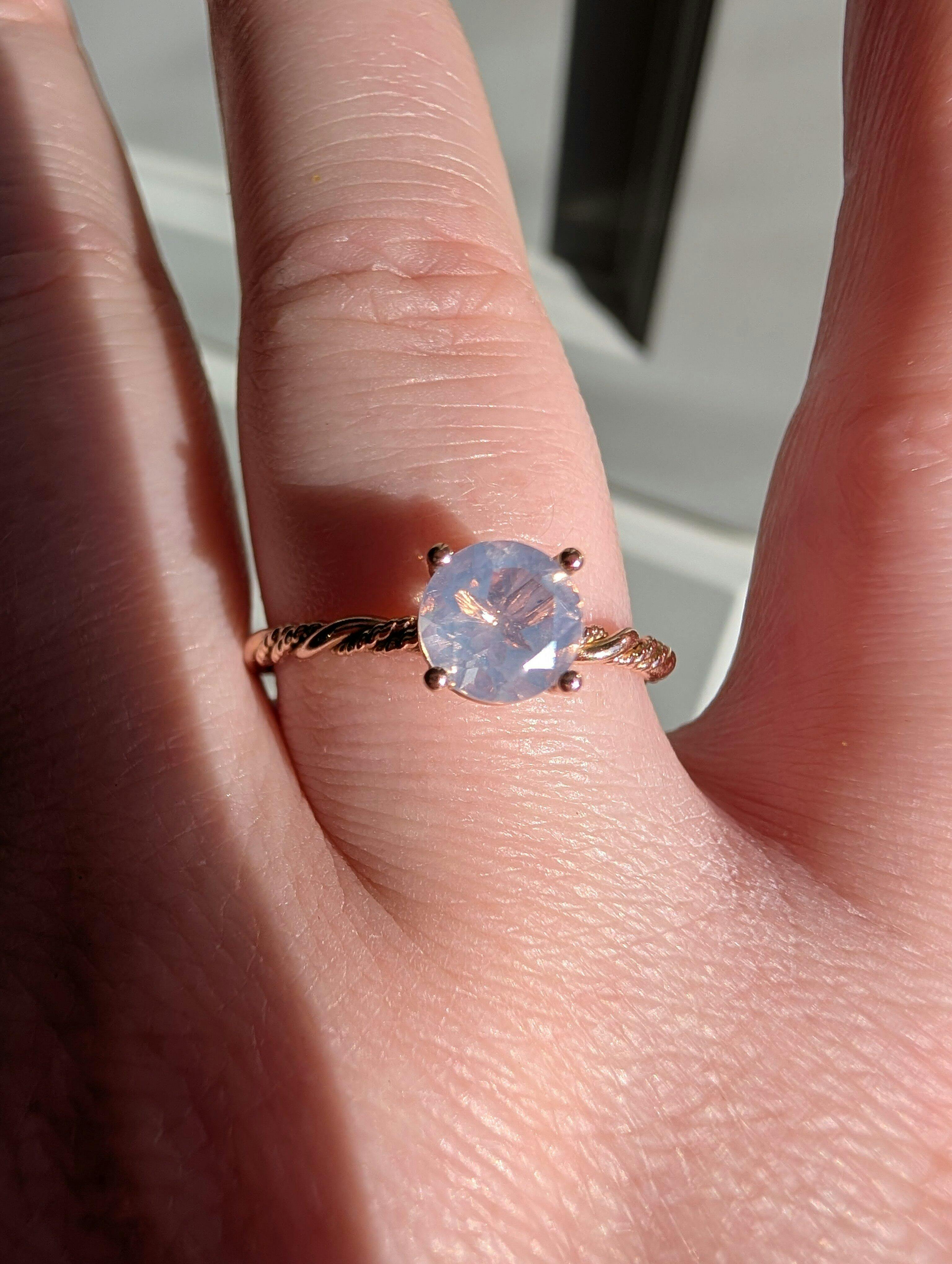 The gem I selected shines so brightly in this ring. The setting is smooth, well polished, perfectly sized, and very comfortable to wear. The prongs haven’t caught on my sleeves or threads, and it was delivered in a beautiful ring box and even a care kit for the silver!