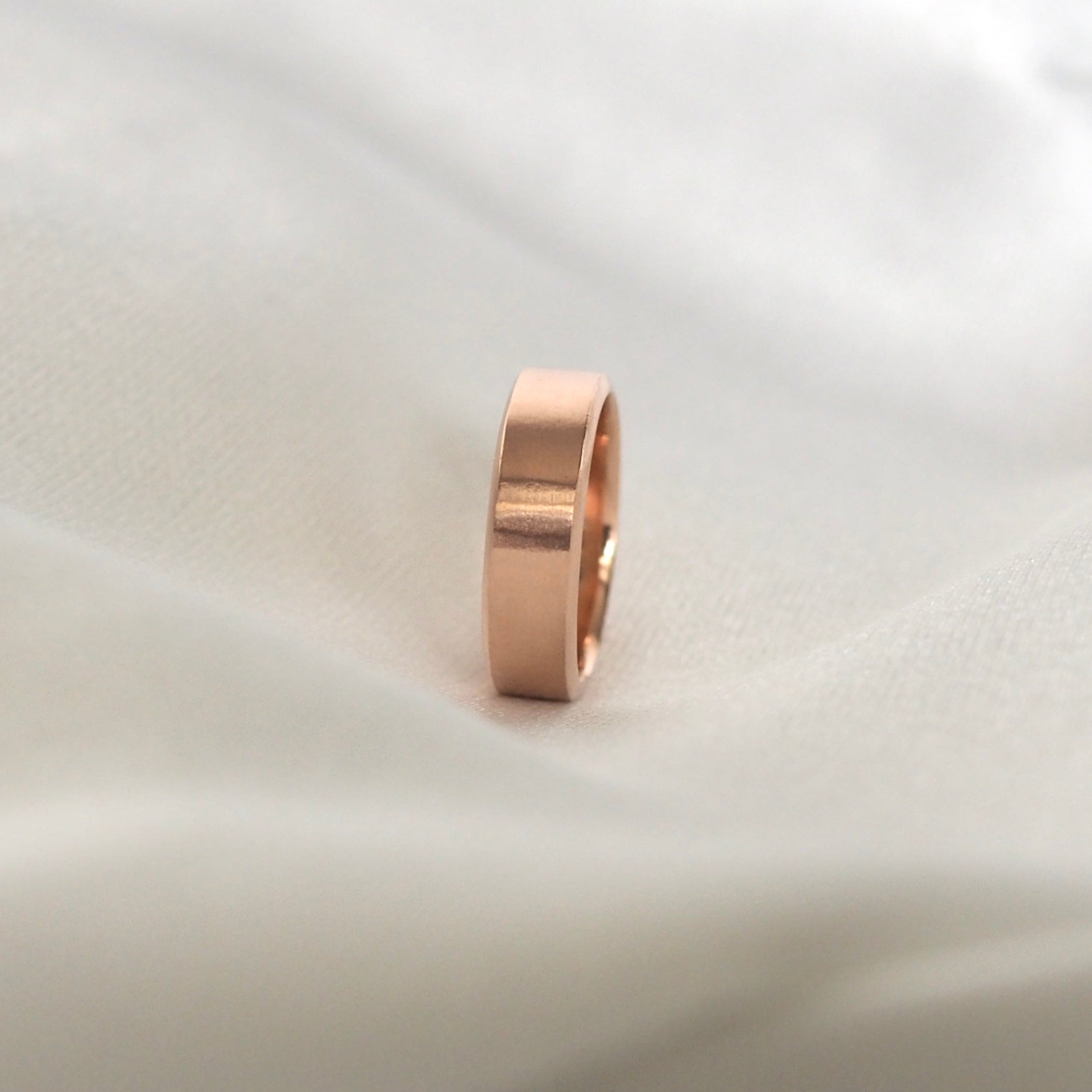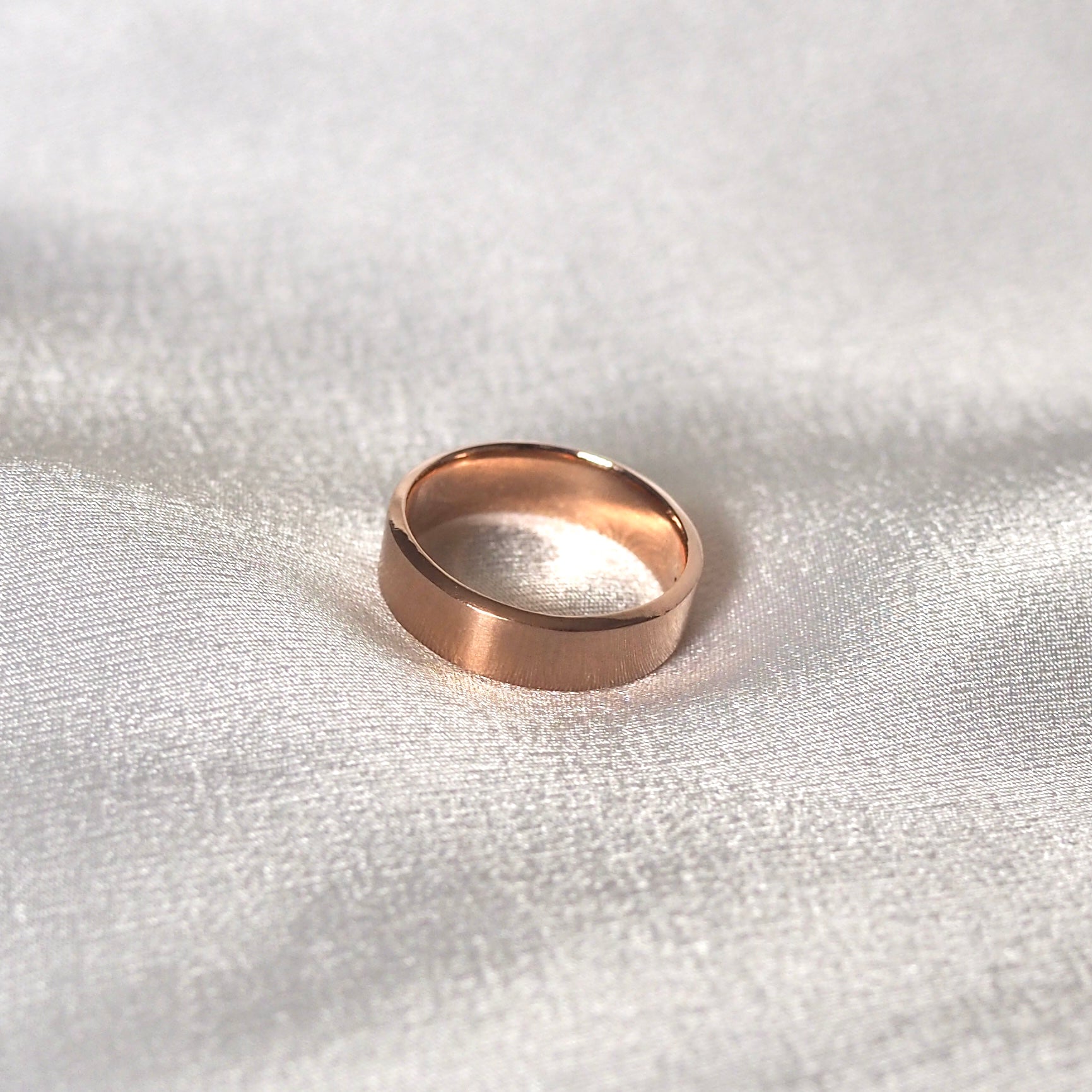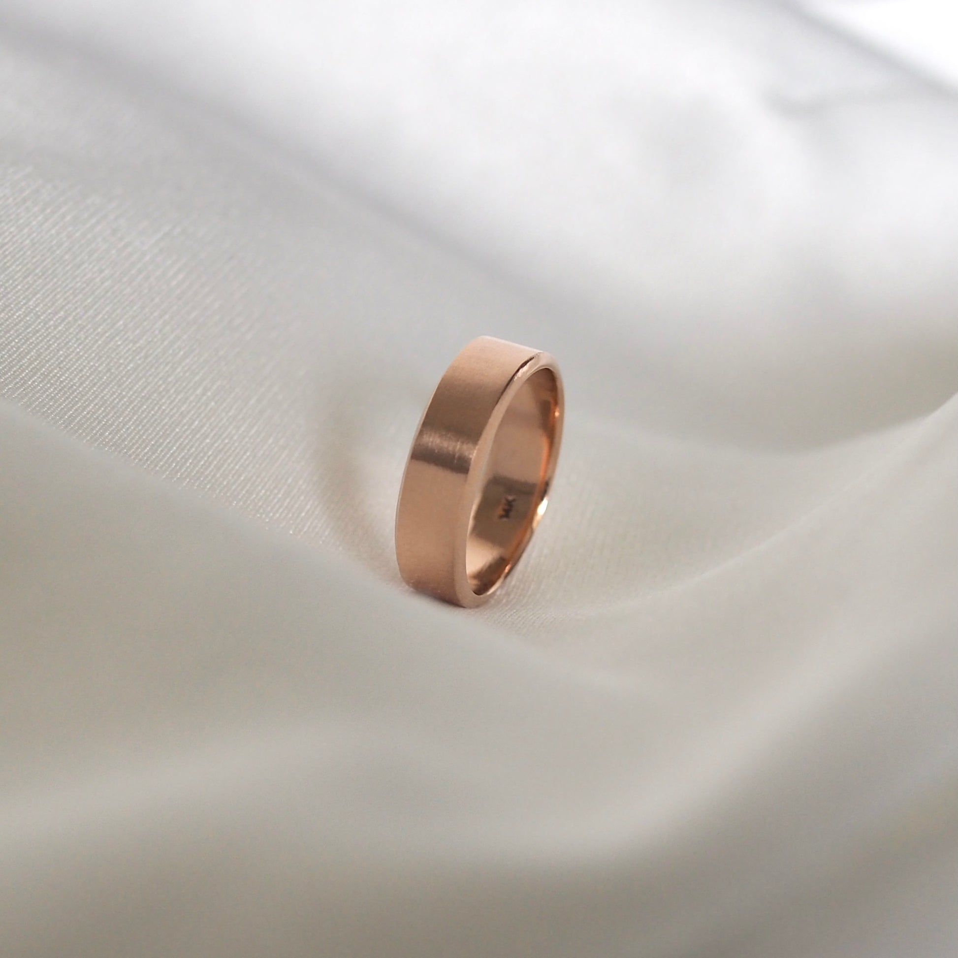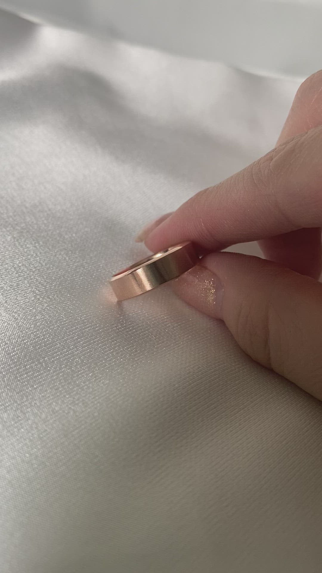 This wedding ring is 5-7mm wide and 1-1.5mm thick. This ring has a matte finish with glossy beveled edges. The interior is rounded off to create a comfort fit, a smooth and easy slide onto the finger. I recommend ordering about ½ size larger than your usual thin-band size if you haven’t measured with a wide ring sizer.
