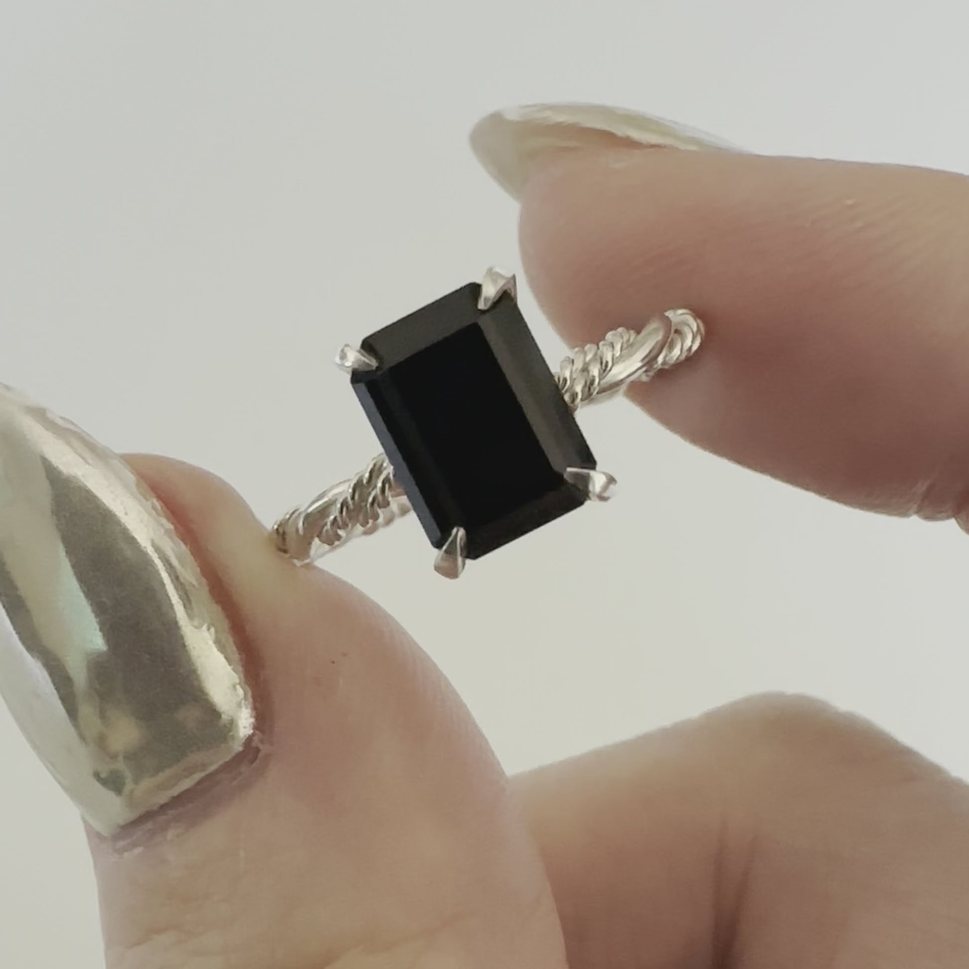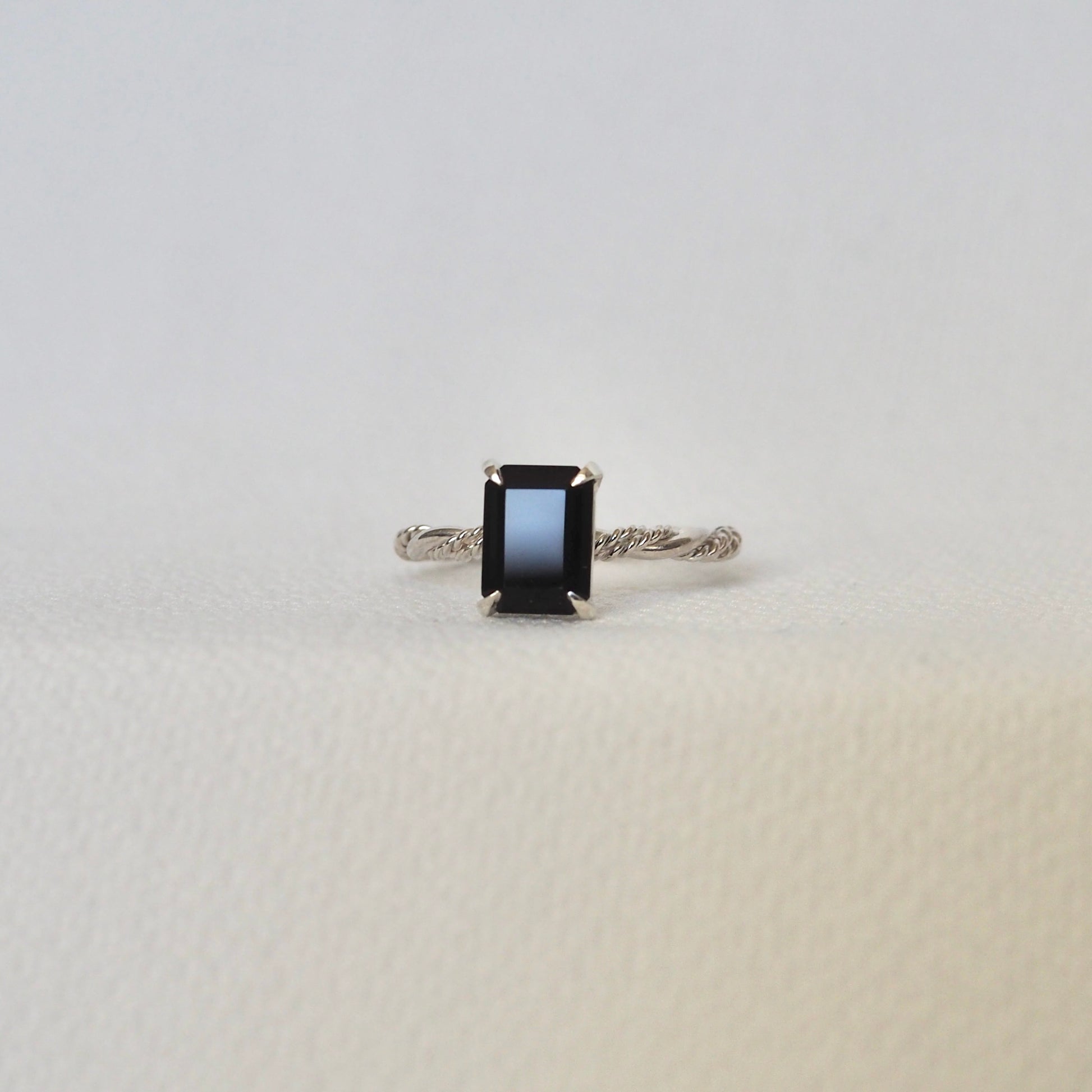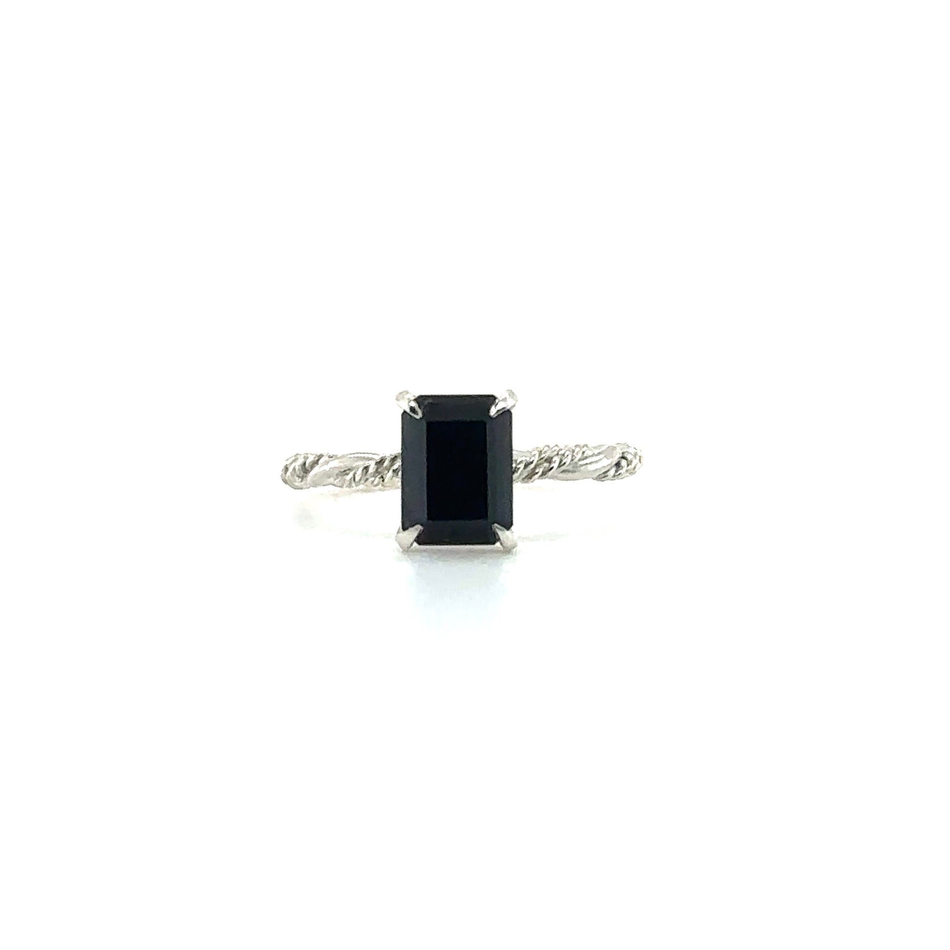 This is a solitaire Unity Ring with a emerald cut black onyx. The band is made with two twisted bands and one smooth band united together. This band can represent coming together or a united bond that is closely intertwined together. It has a glittery and shiny appearance.
