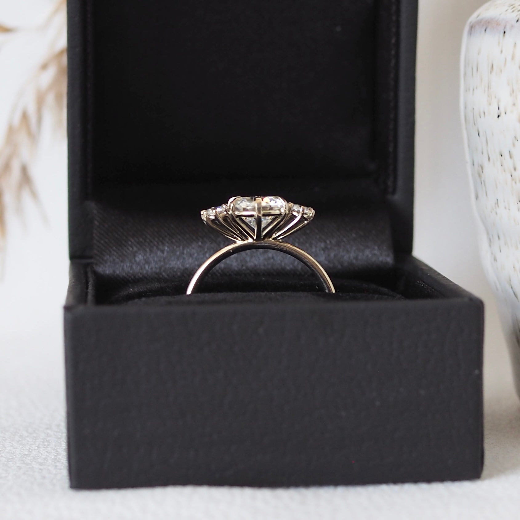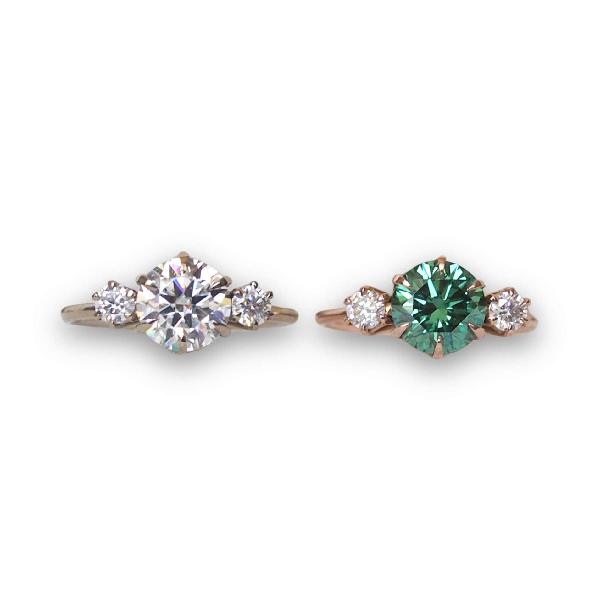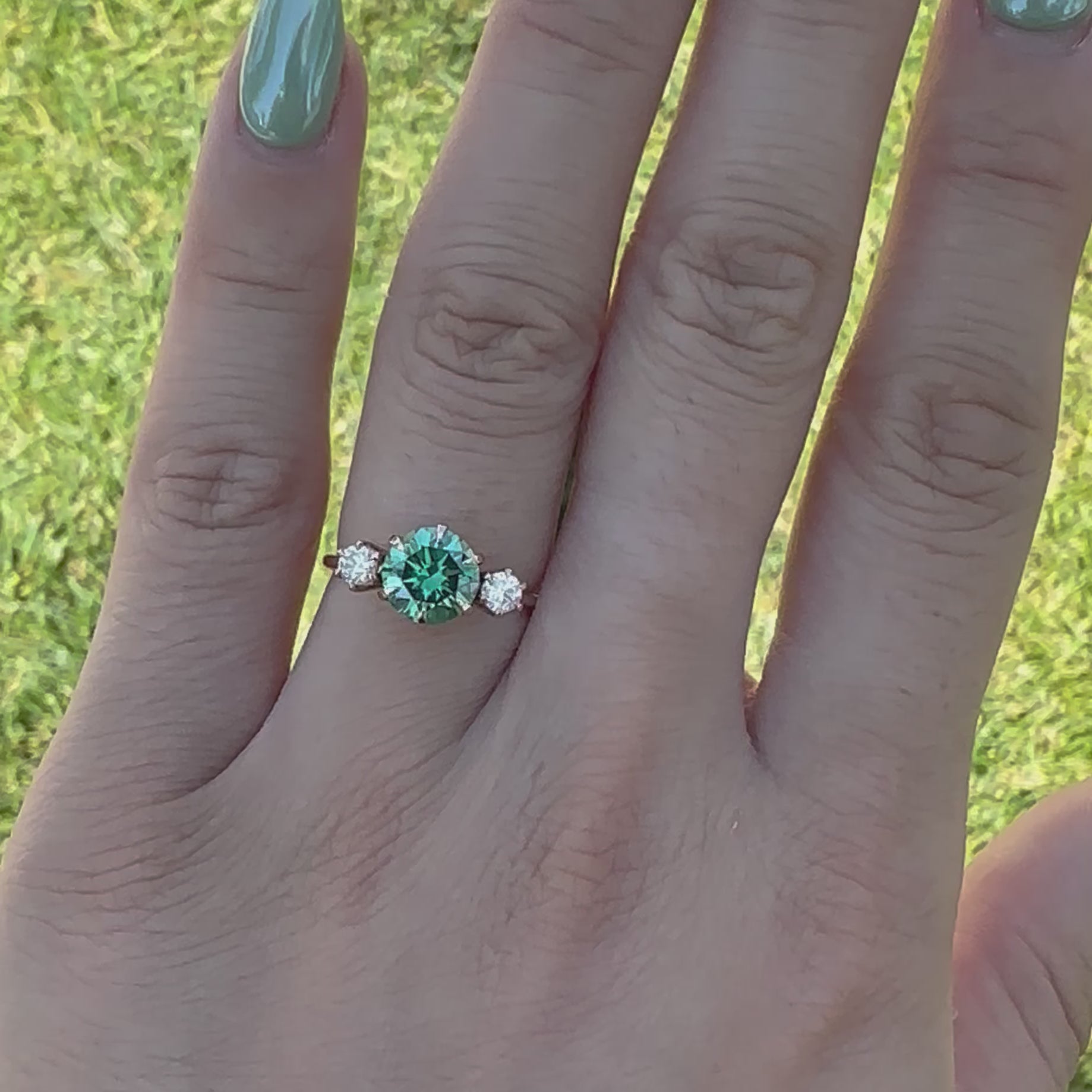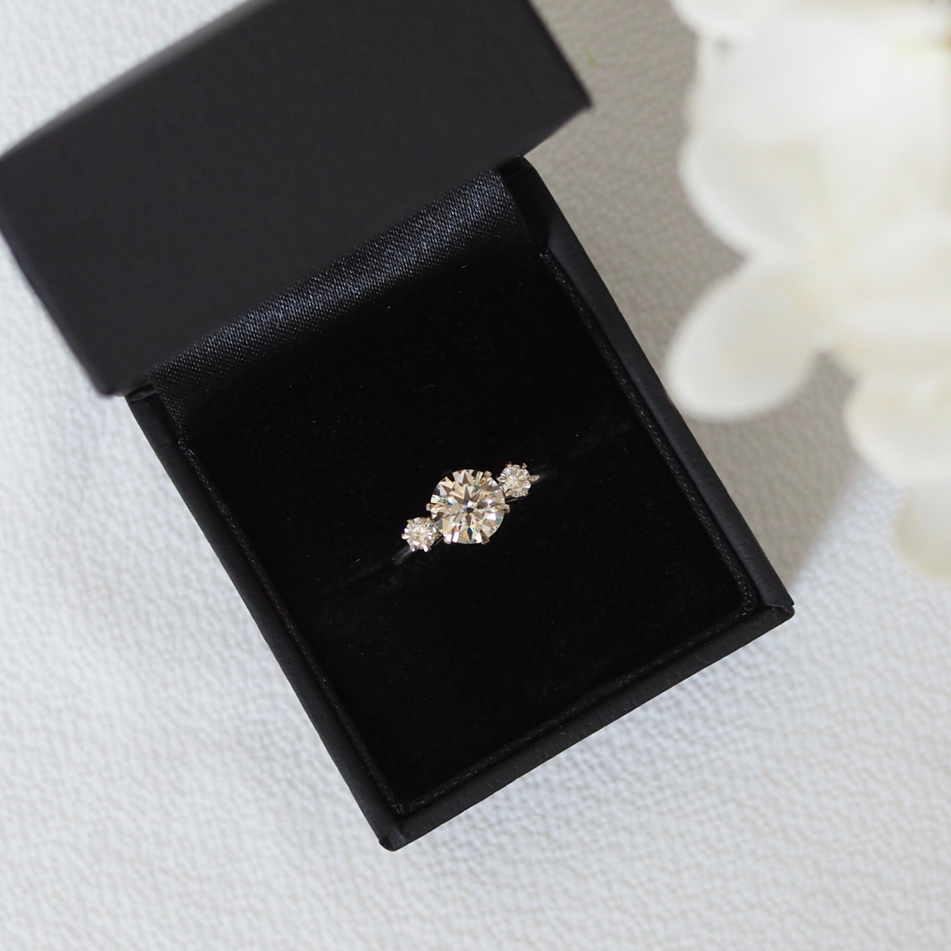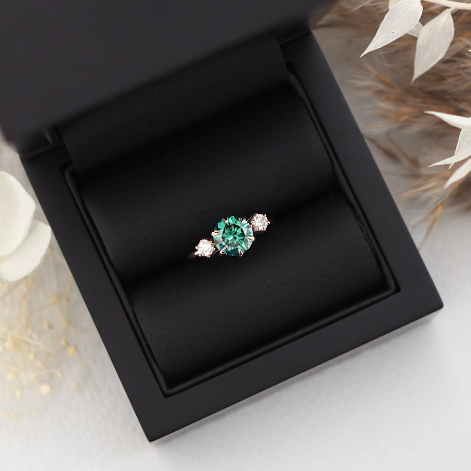 This ring was designed with a plant lover in mind. The setting holding the three stones together create petals of a flower, representing a growing and blooming future together.