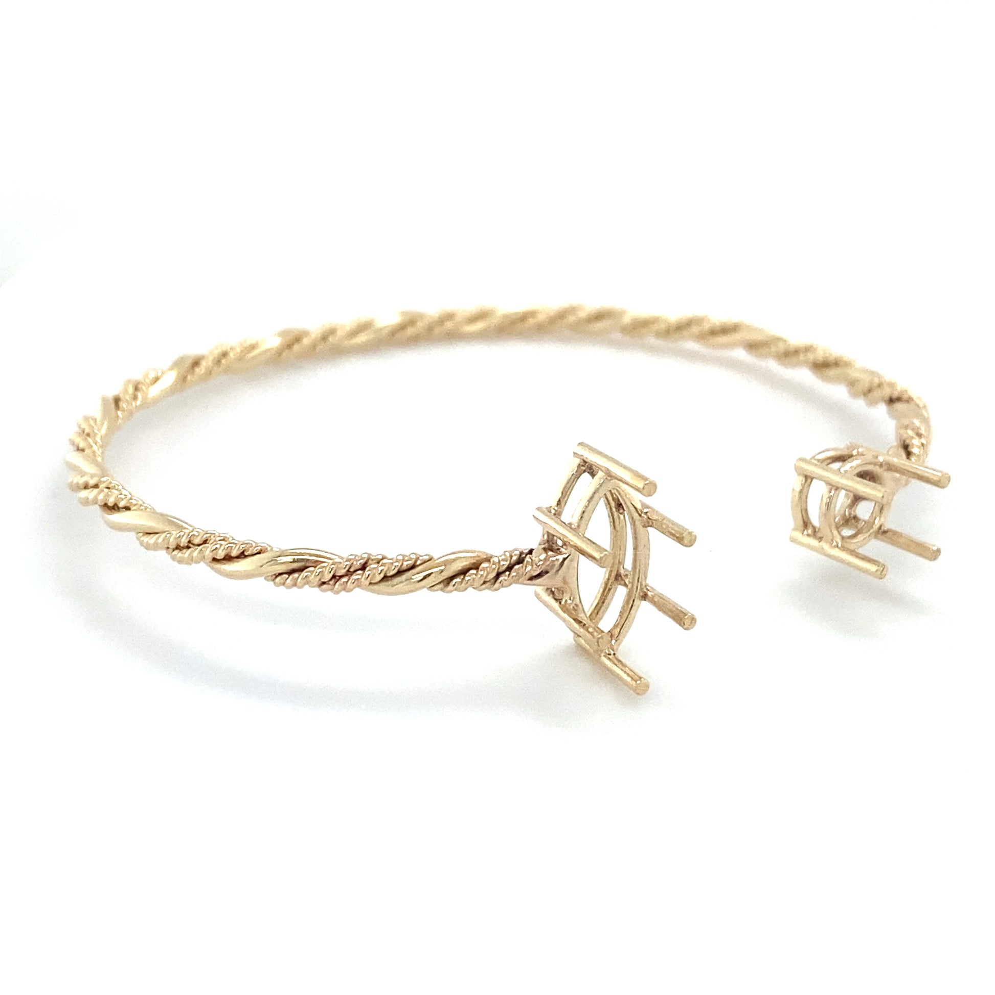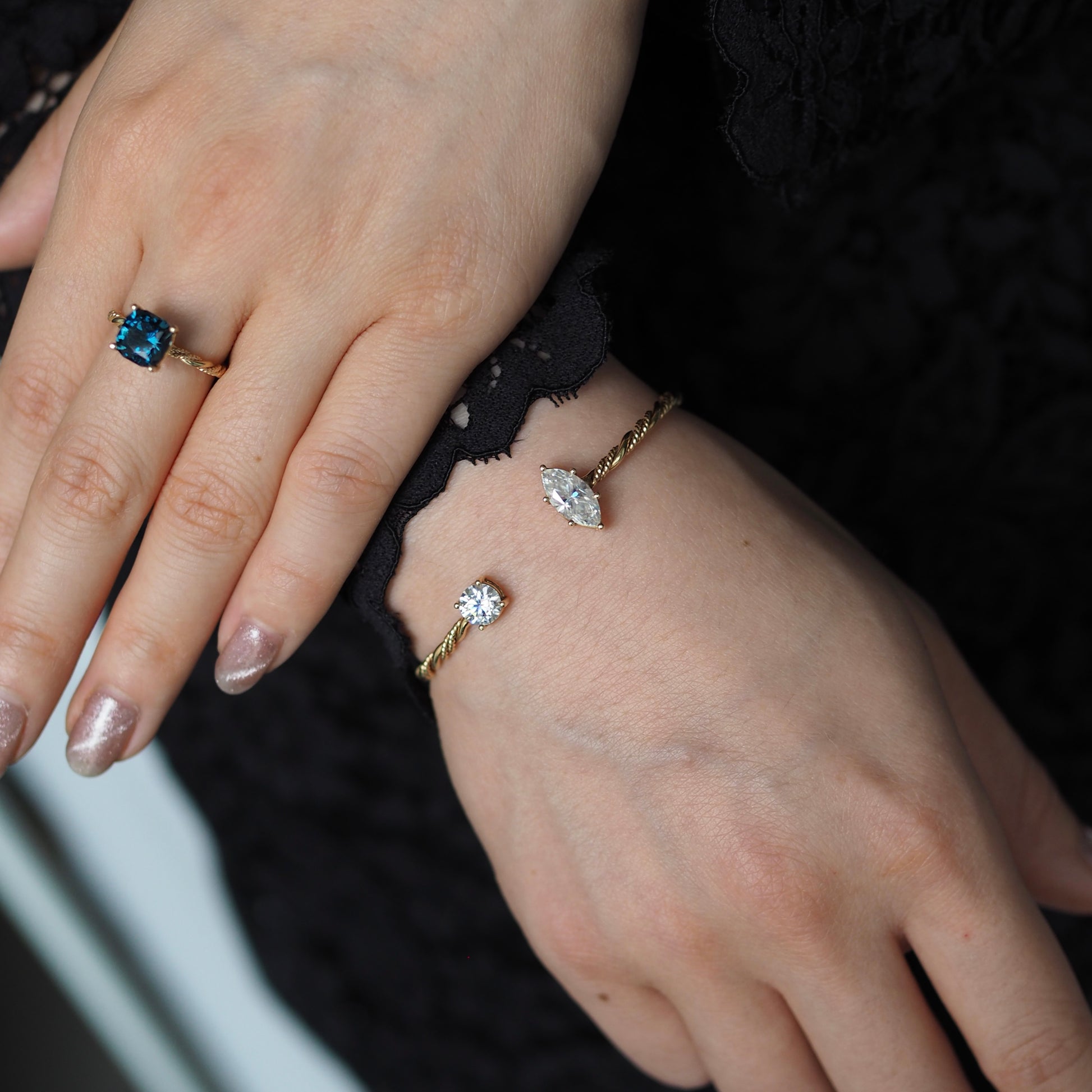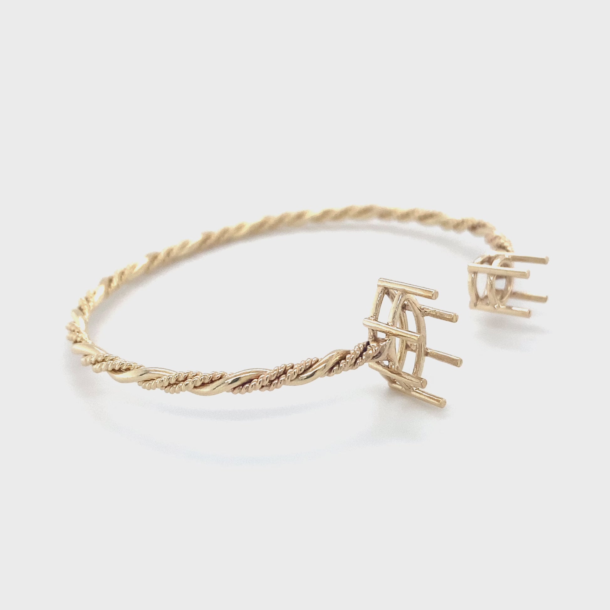 This bracelet has two gemstones connected by two twisted bands and one smooth band united together. This bracelet can represent coming together or a united bond that is closely intertwined together. It has a glittery and shiny appearance with your choice of stones.