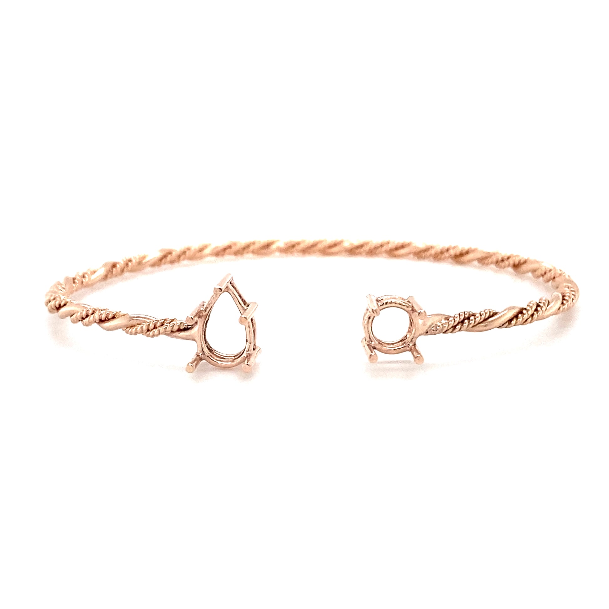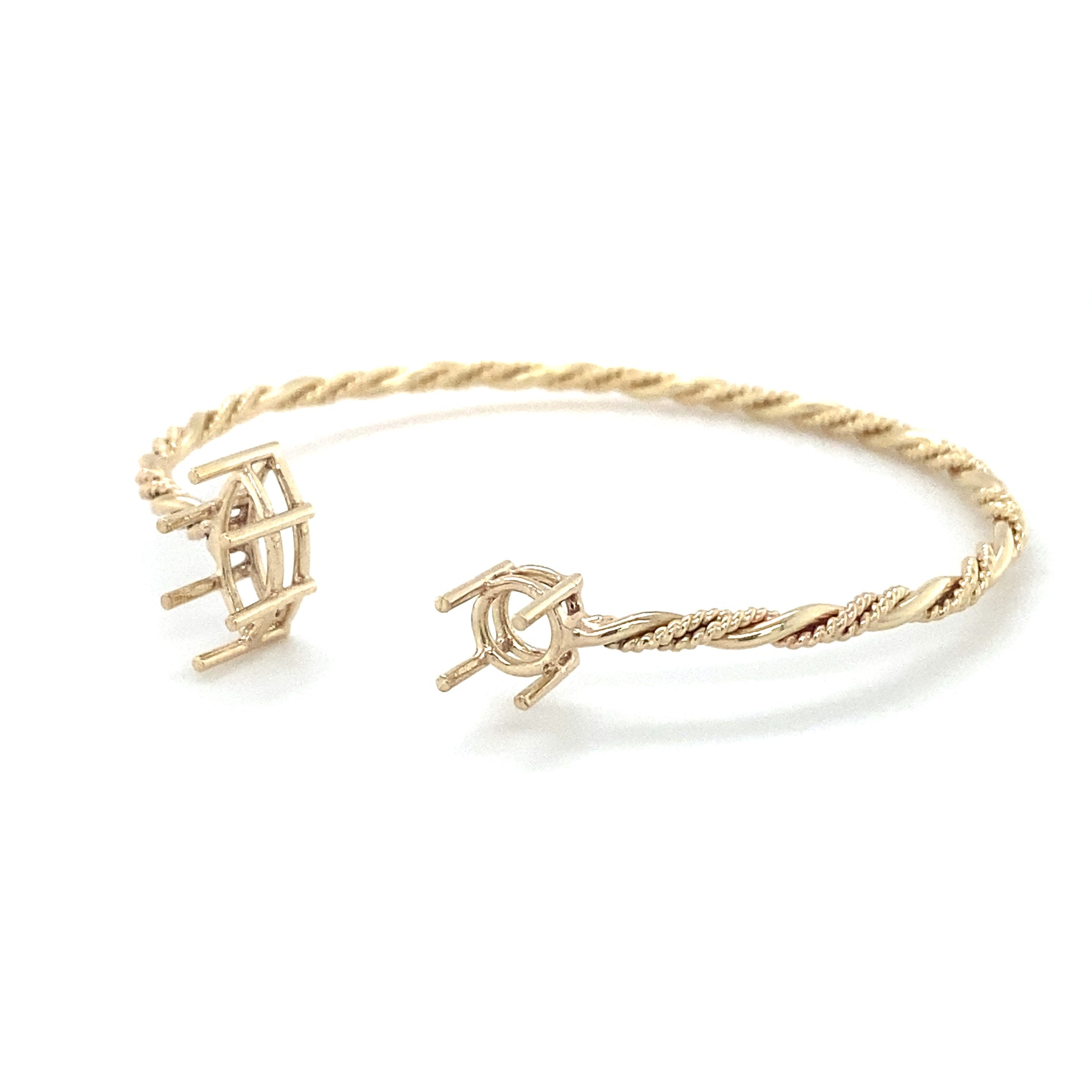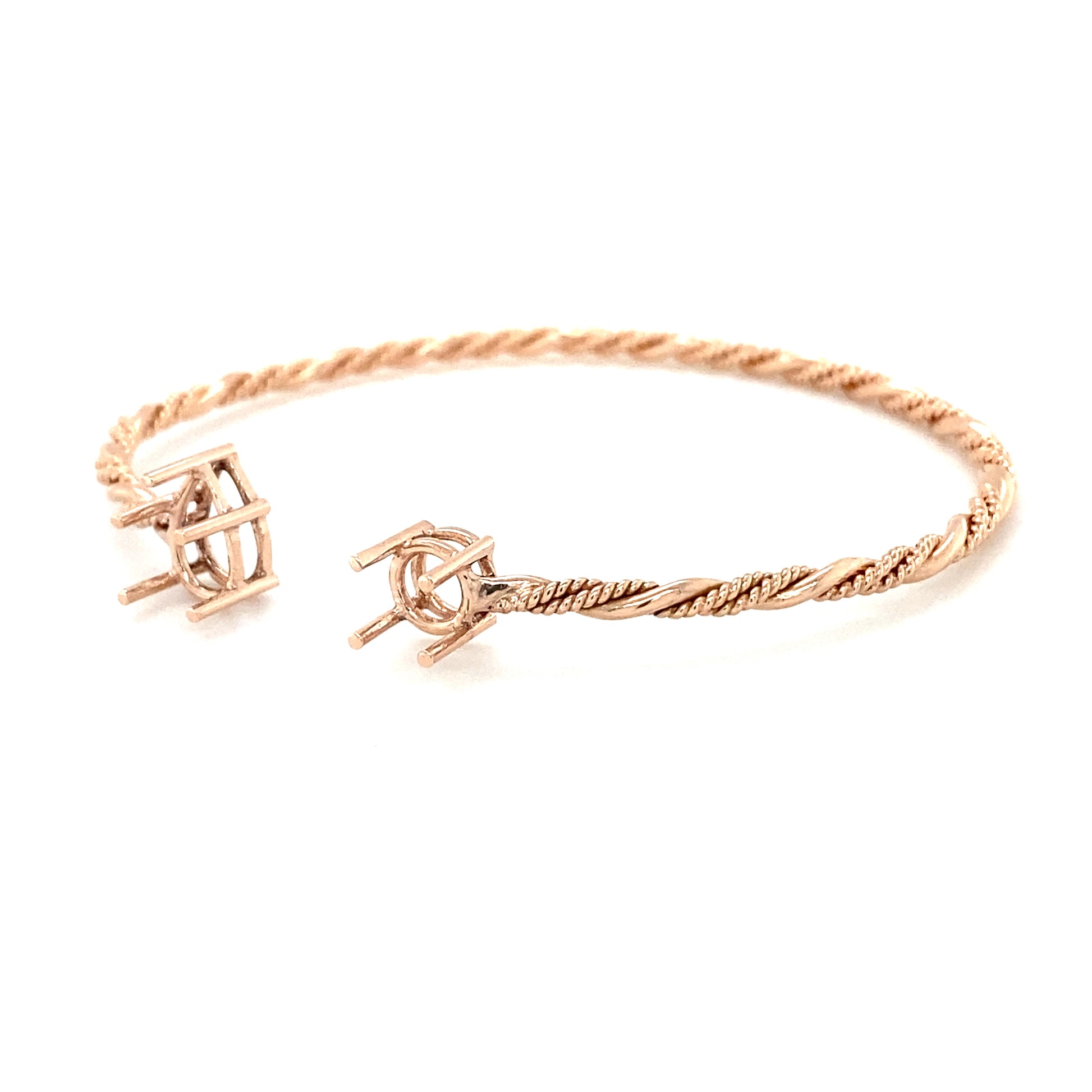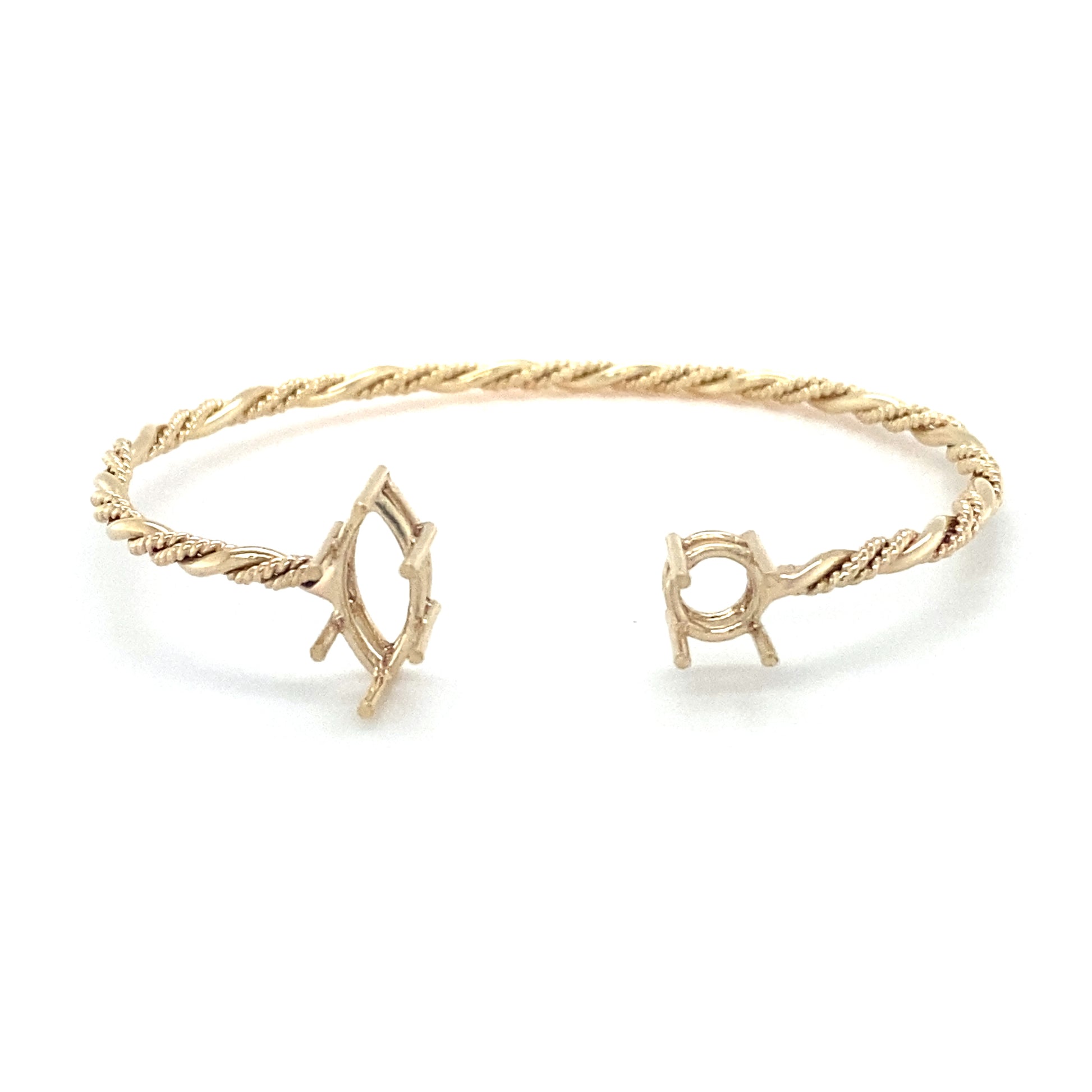 This bracelet has two gemstones connected by two twisted bands and one smooth band united together. This bracelet can represent coming together or a united bond that is closely intertwined together. It has a glittery and shiny appearance with your choice of stones.