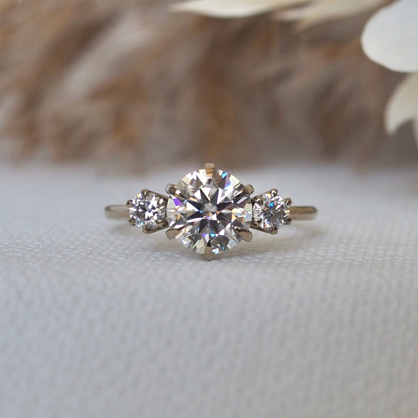 This ring was designed with a plant lover in mind. The setting holding the three stones together create petals of a flower, representing a growing and blooming future together.