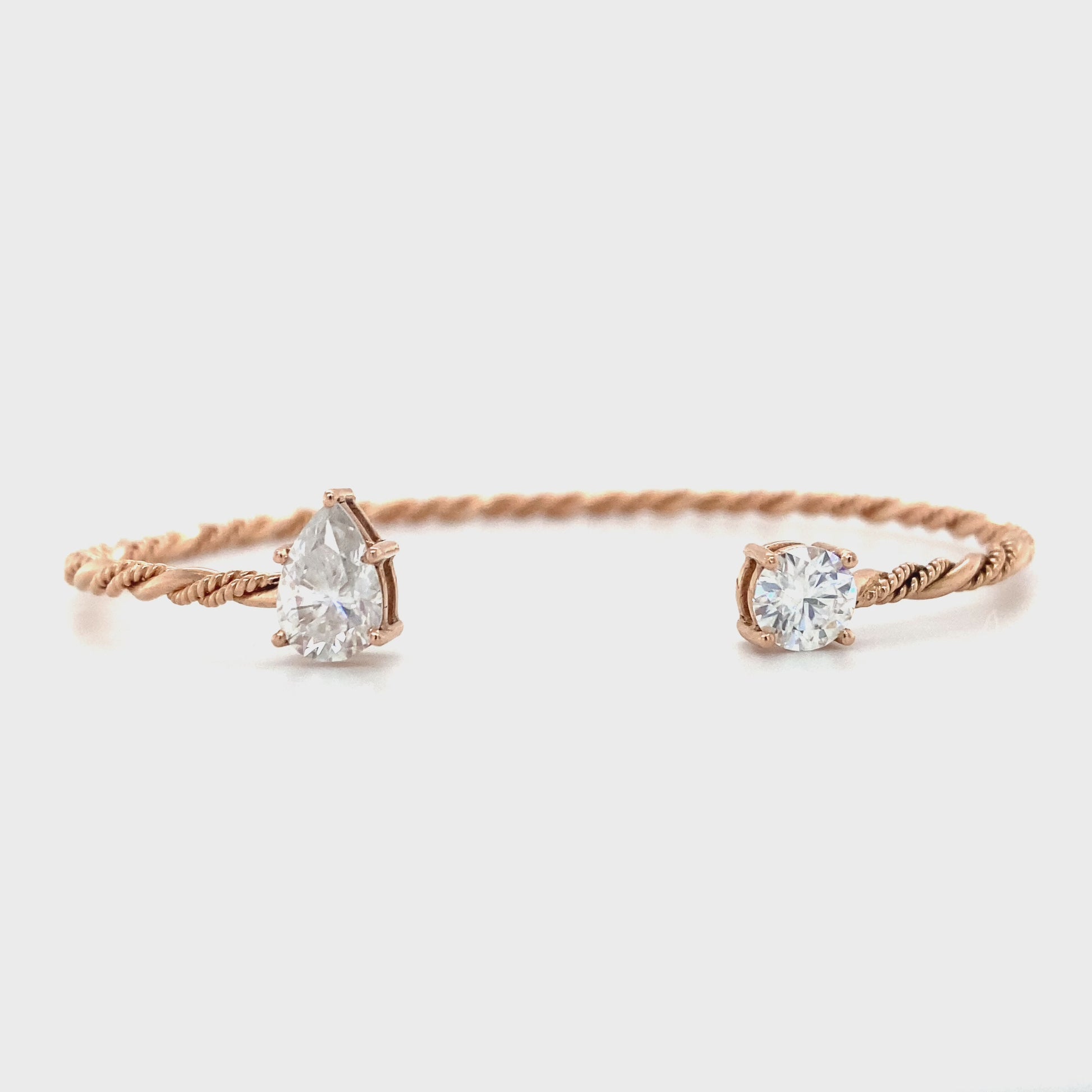 This bracelet has two white moissanite gemstones connected by two twisted bands and one smooth band united together. This bracelet can represent coming together or a united bond that is closely intertwined together. It has a glittery and shiny appearance with dazzling moissanite stones.