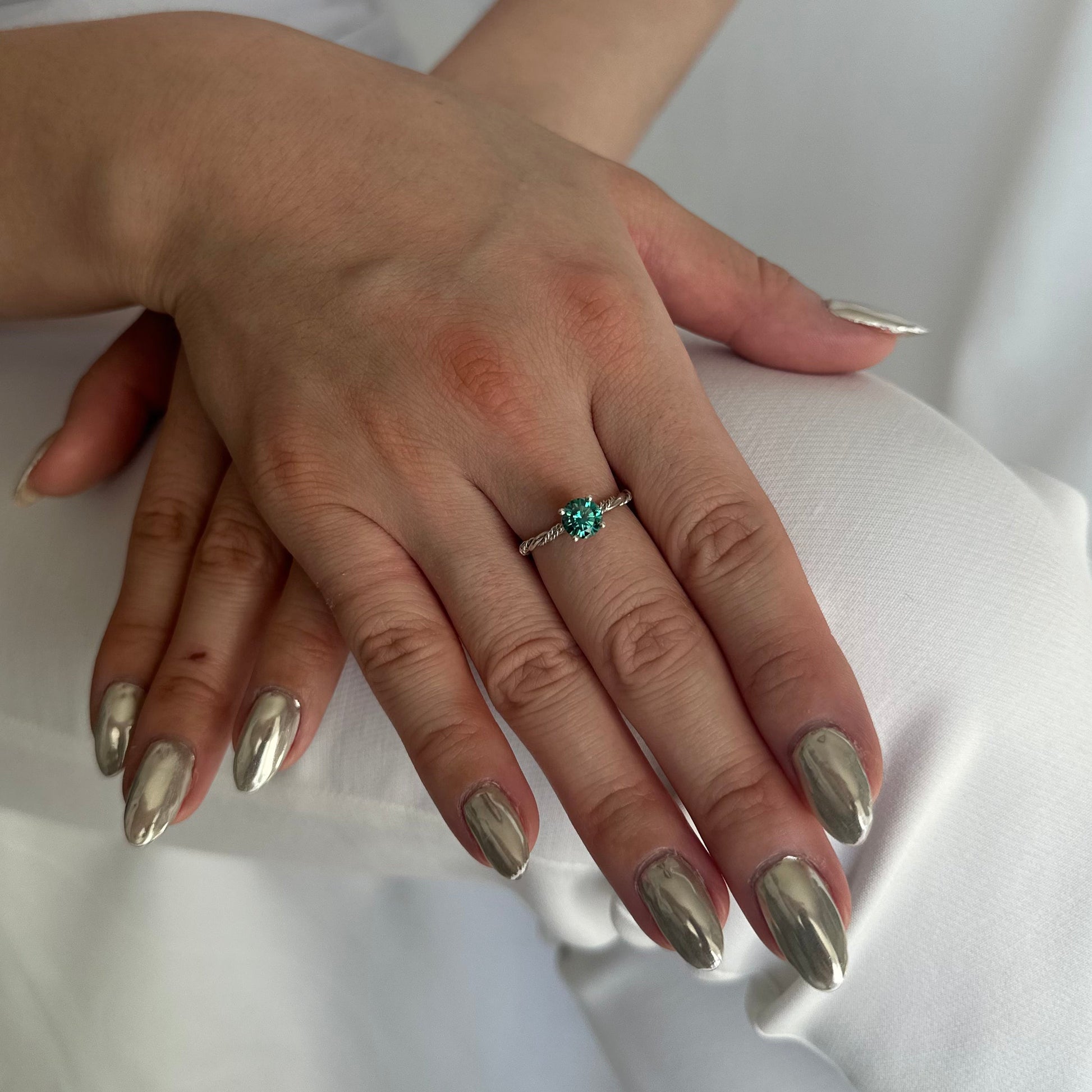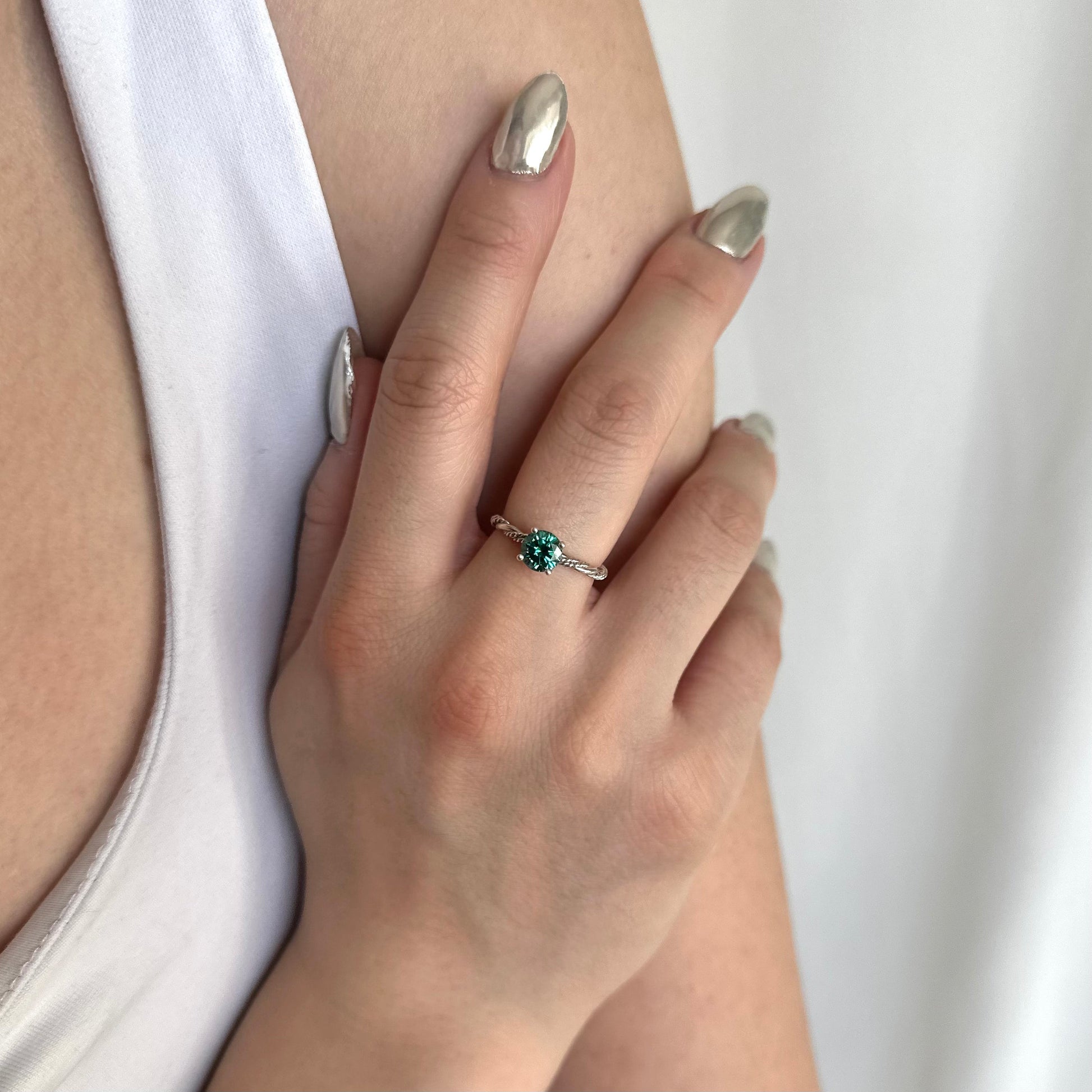 This is a solitaire Unity Ring with a round green moissanite. The band is made with two twisted bands and one smooth band united together. This band can represent coming together or a united bond that is closely intertwined together. It has a glittery and shiny appearance.