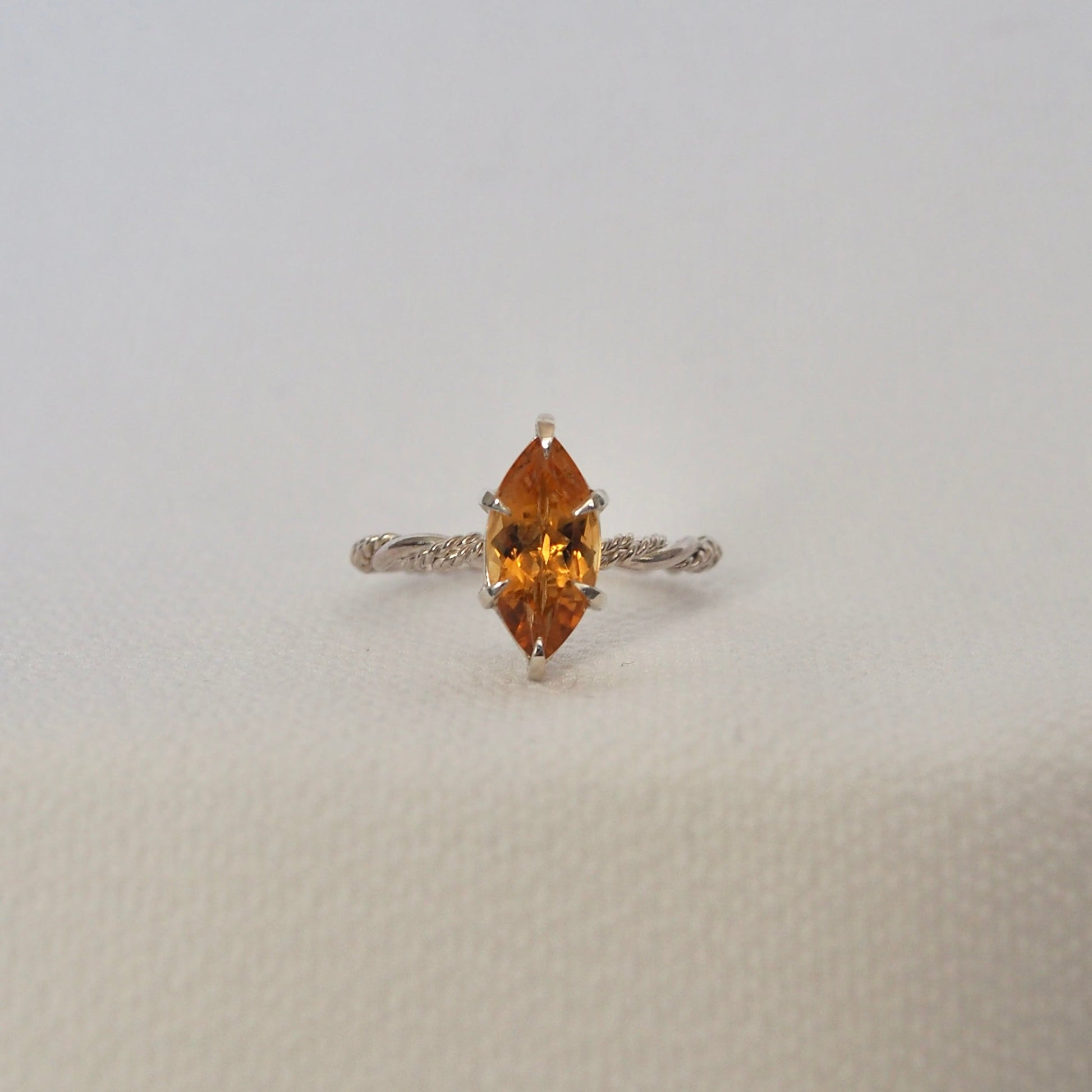 This is a solitaire Unity Ring with a marquise cut citrine. The band is made with two twisted bands and one smooth band united together. This band can represent coming together or a united bond that is closely intertwined together. It has a glittery and shiny appearance.