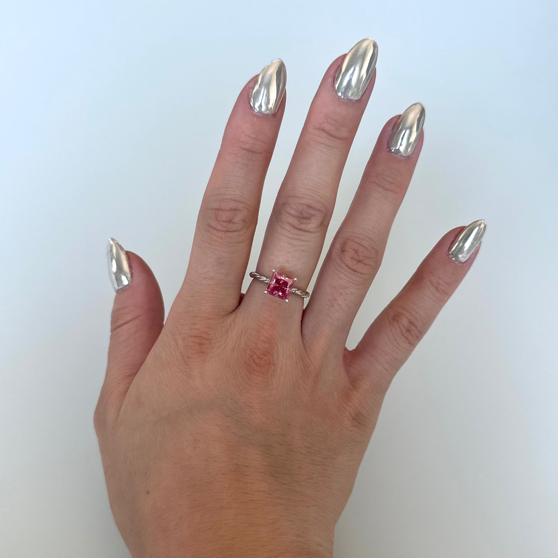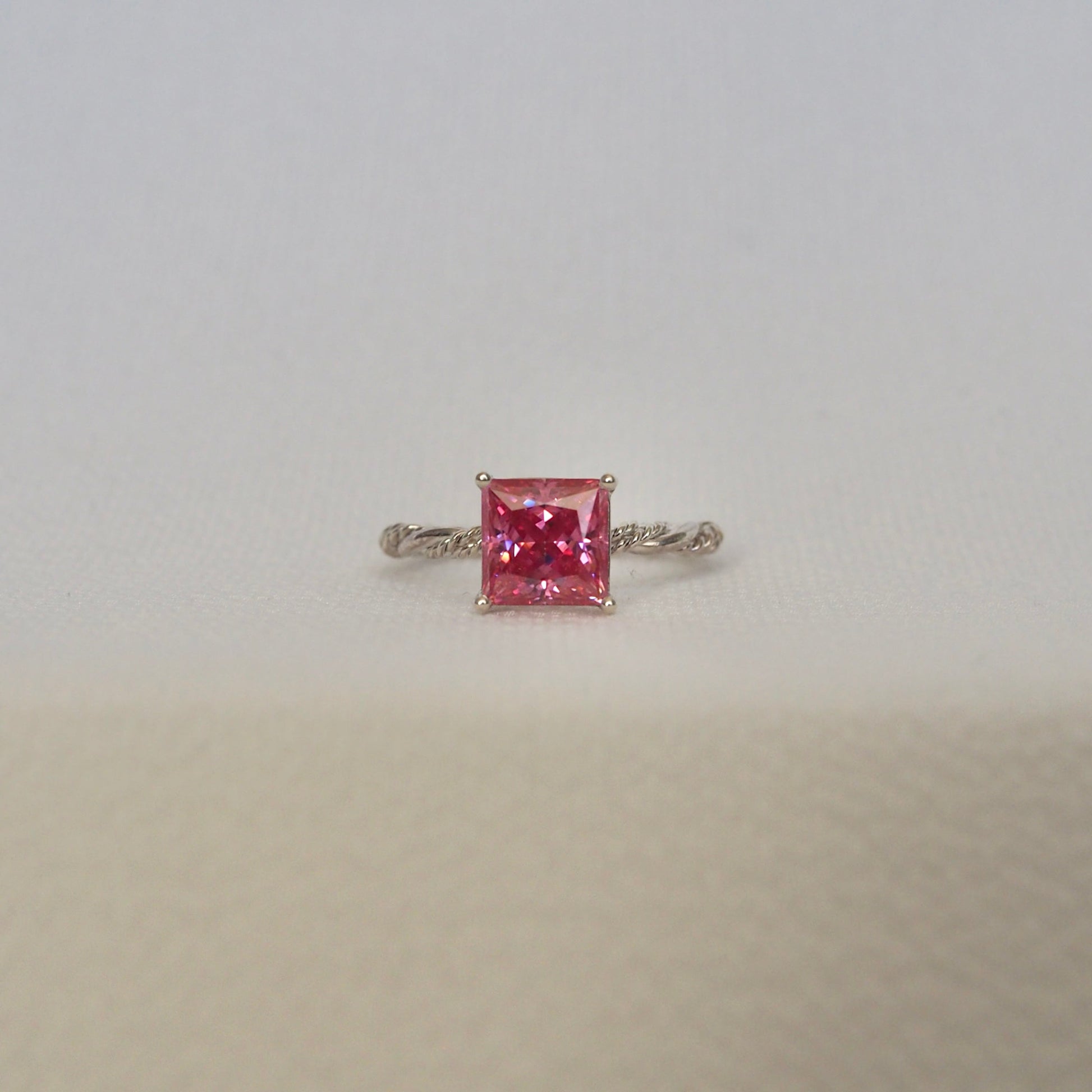 This is a solitaire Unity Ring with a princess cut pink moissanite. The band is made with two twisted bands and one smooth band united together. This band can represent coming together or a united bond that is closely intertwined together. It has a glittery and shiny appearance.