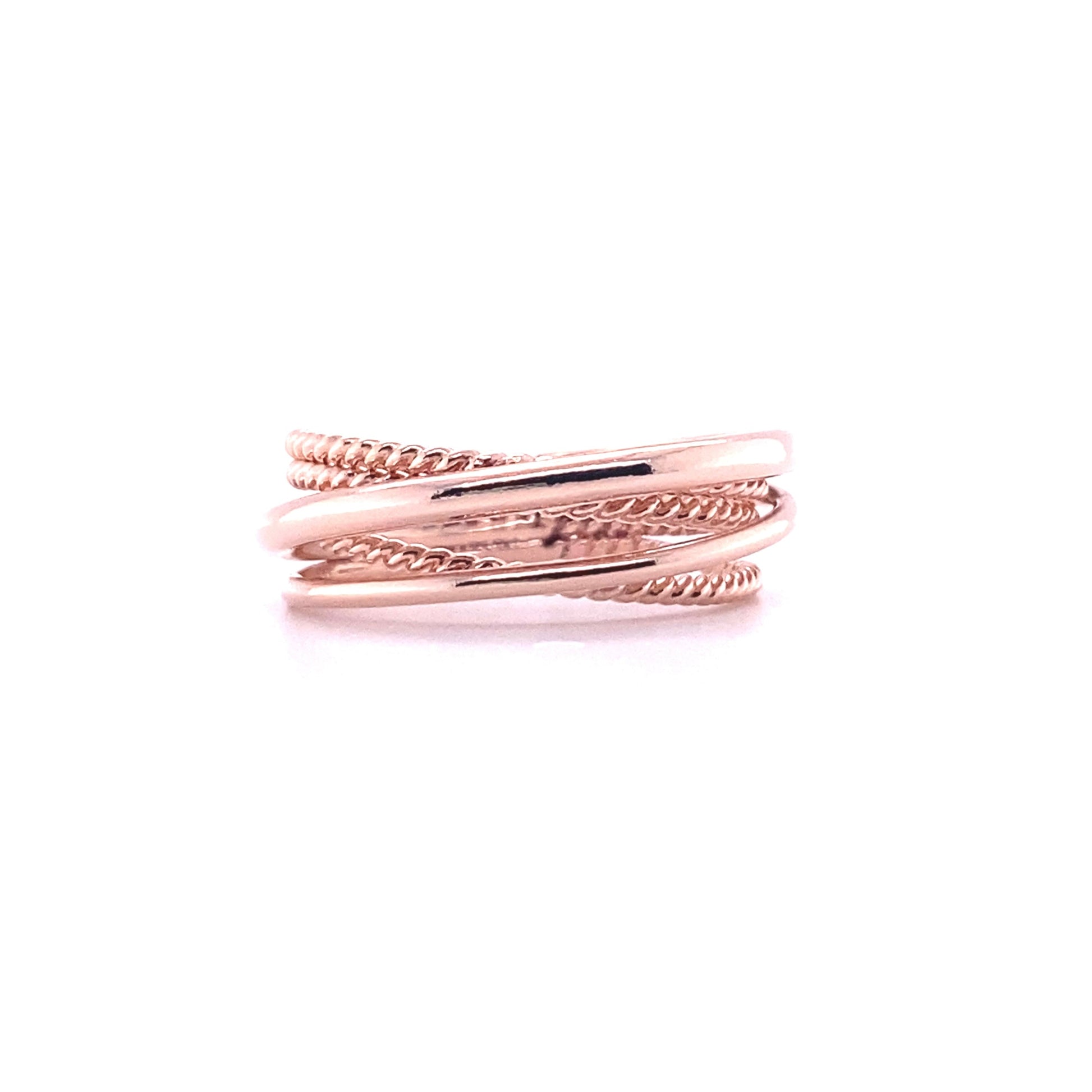 This crossover ring is an original NHU Jewelry design made with two rounded bands and three twisted bands fused together.