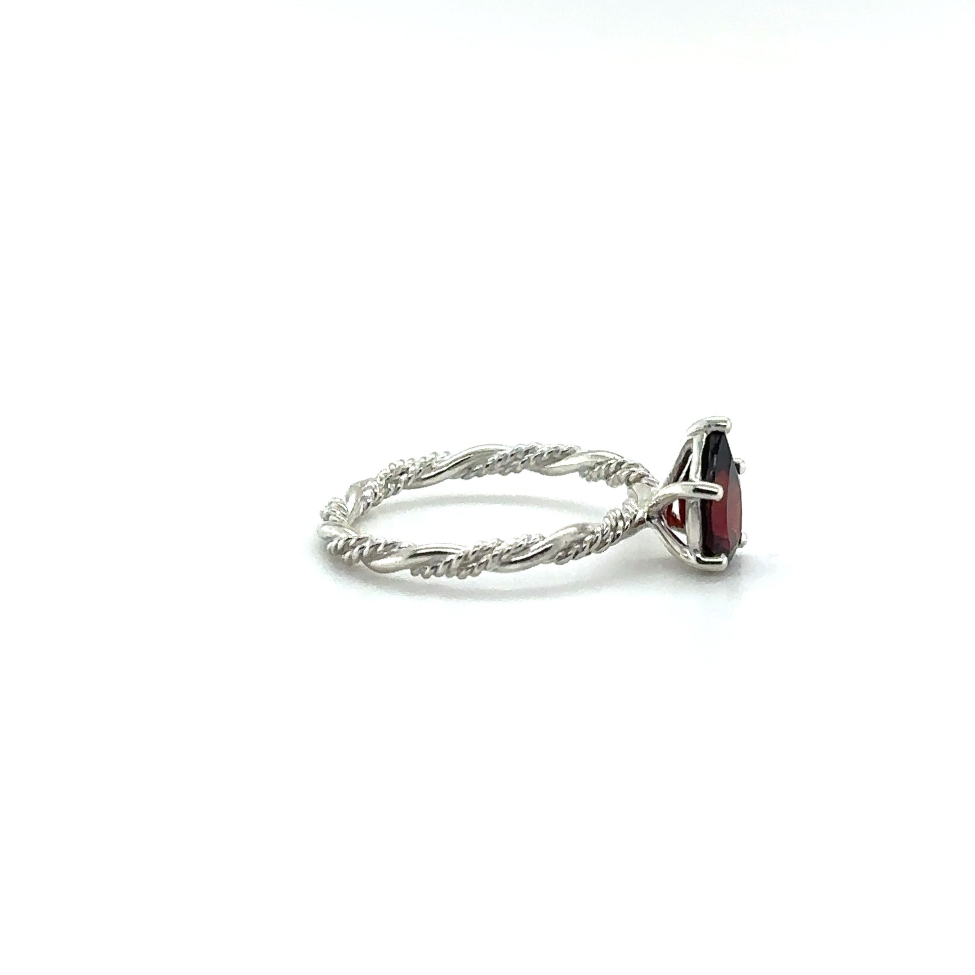 This is a solitaire Unity Ring with a pear cut Mozambique garnet. The band is made with two twisted bands and one smooth band united together. This band can represent coming together or a united bond that is closely intertwined together. It has a glittery and shiny appearance.
