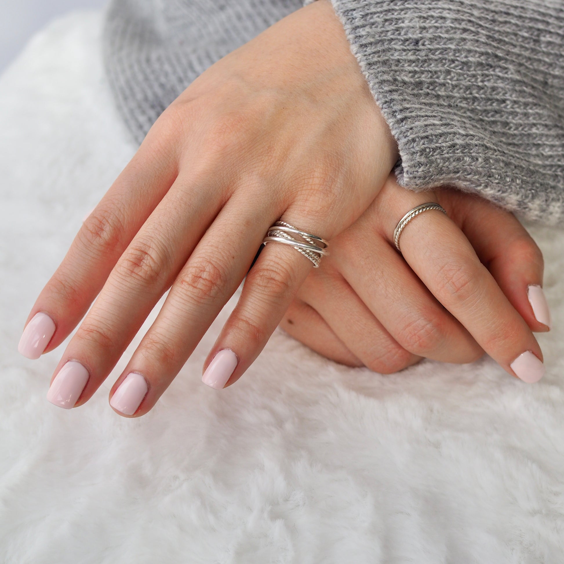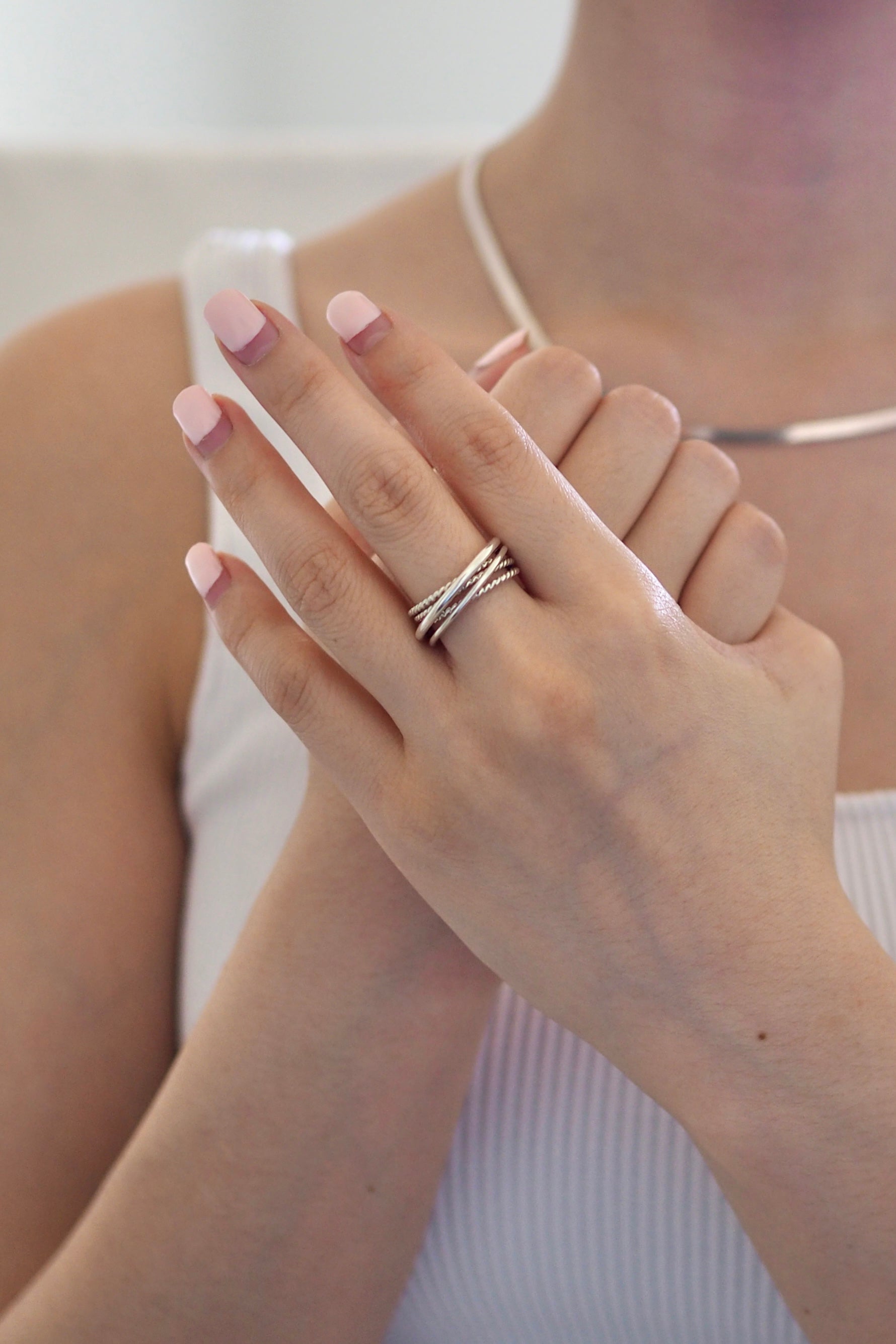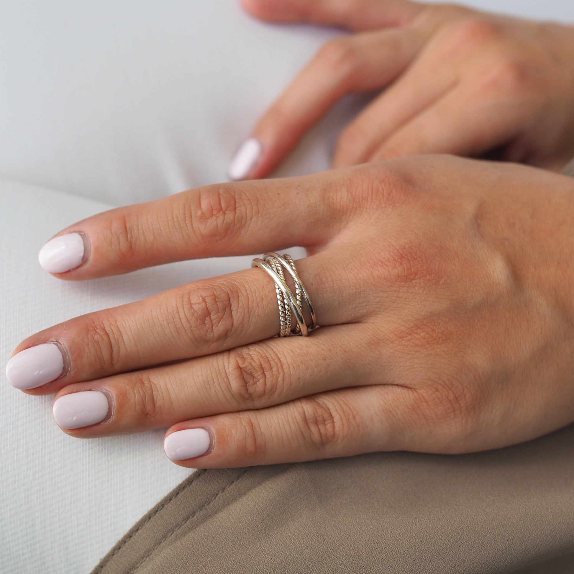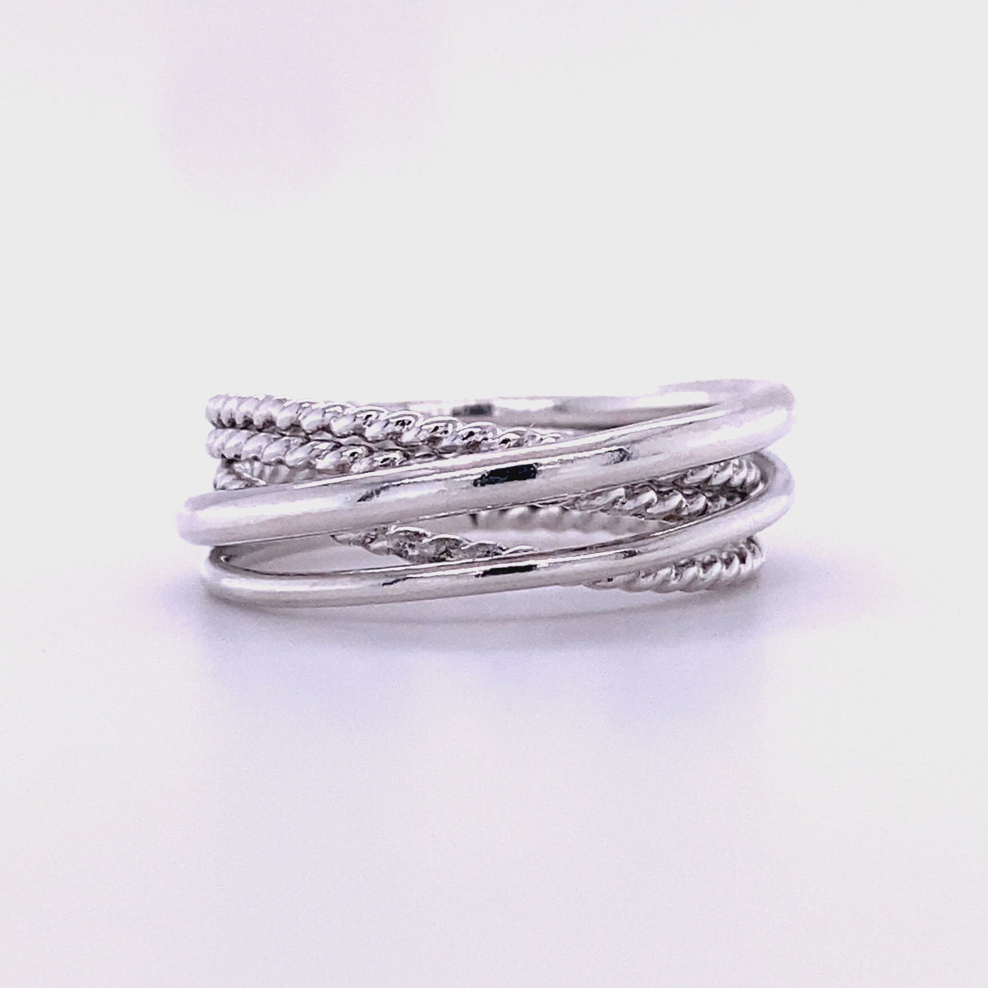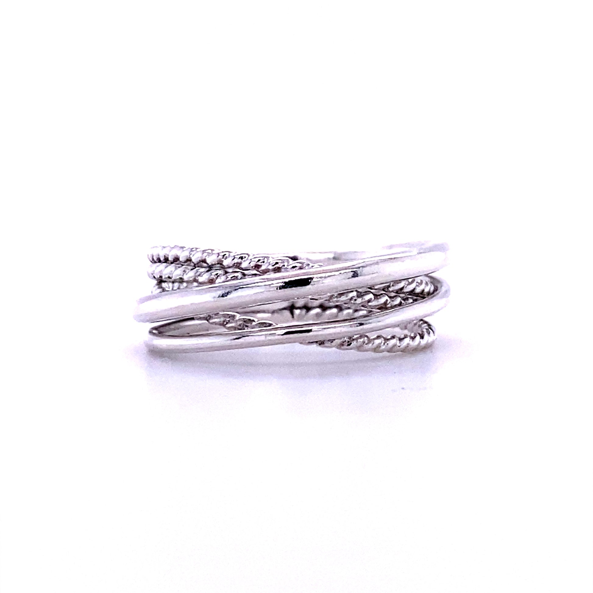 This crossover ring is an original NHU Jewelry design made with two rounded bands and three twisted bands fused together.