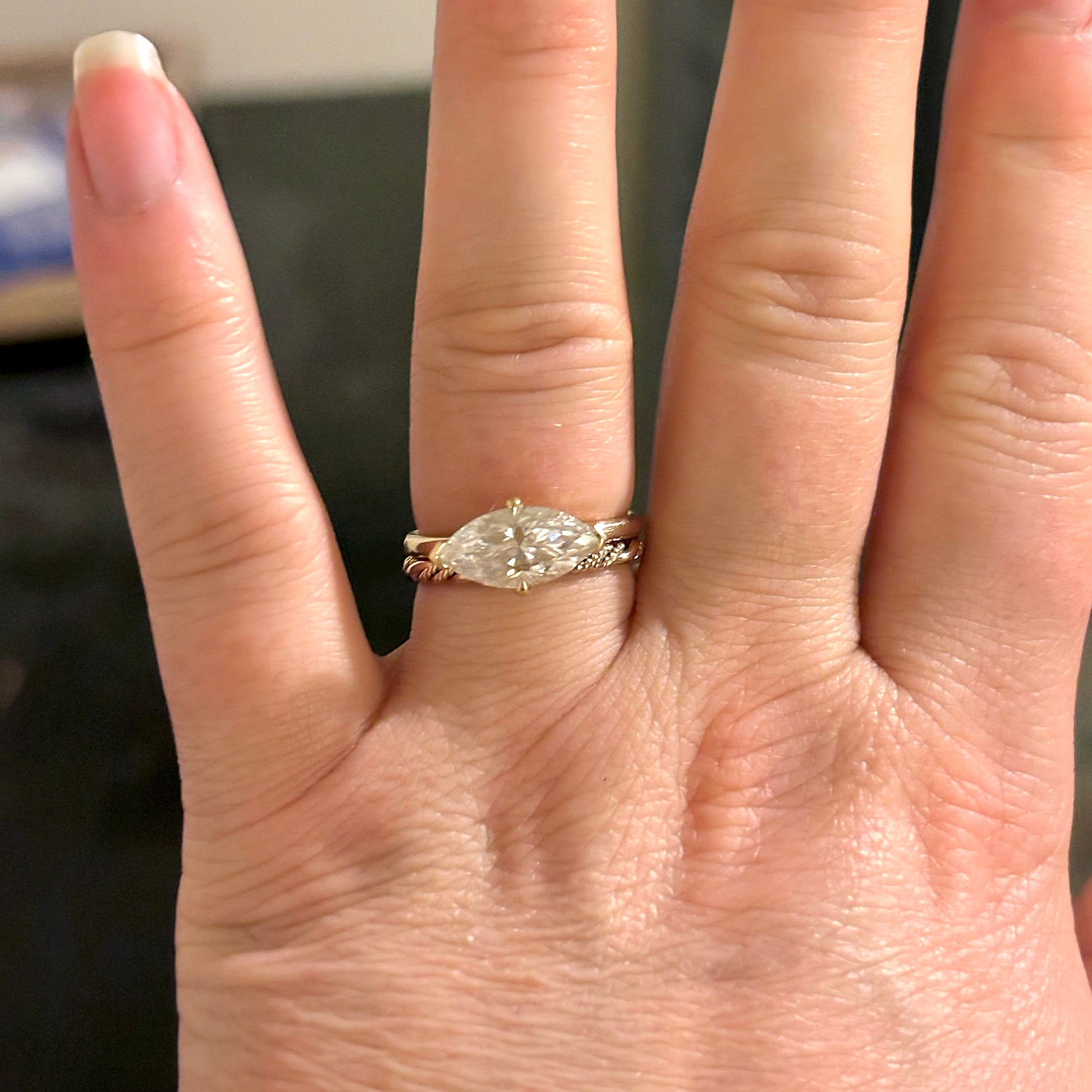 This ring band is made with two twisted bands and one smooth band united together. This band can represent coming together or a united bond that is closely intertwined together. It has a glittery and shiny appearance.