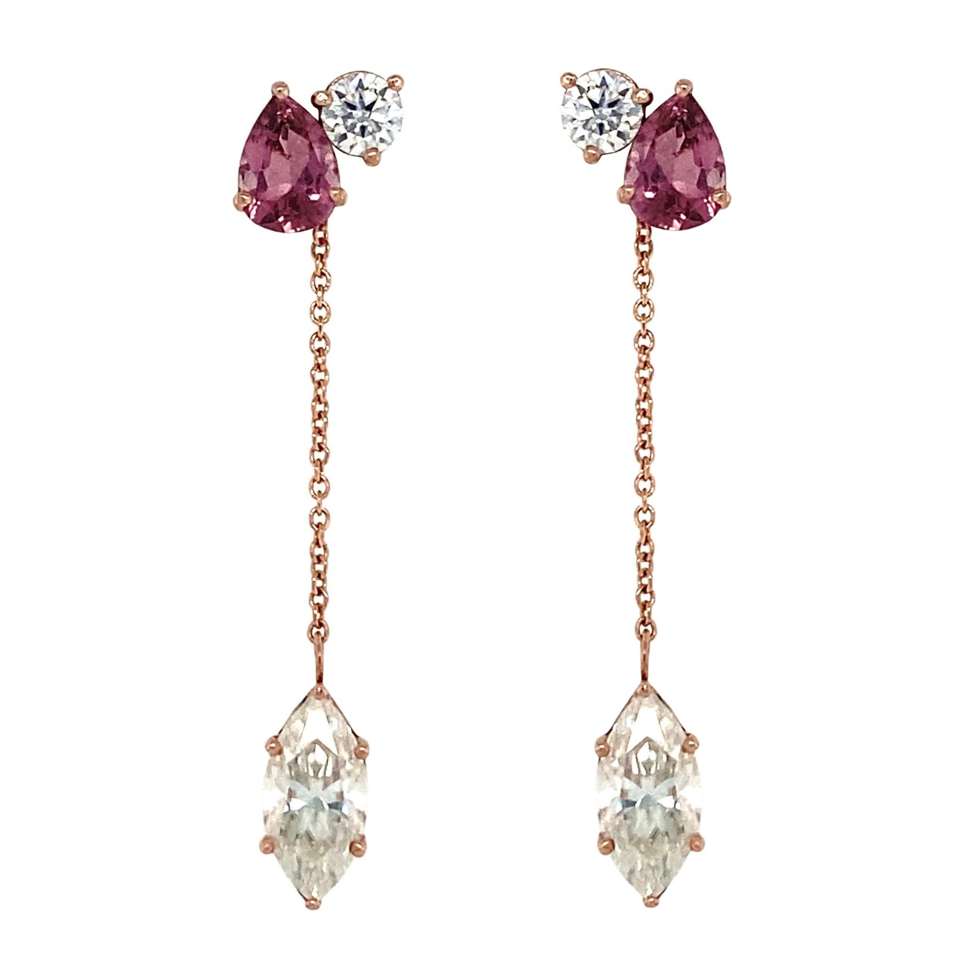 This earring is romantically inspired. A white round moissanite is paired with a pink pear tourmaline to create the stud portion of the earring. The white marquise moissanite dangle piece is removable.